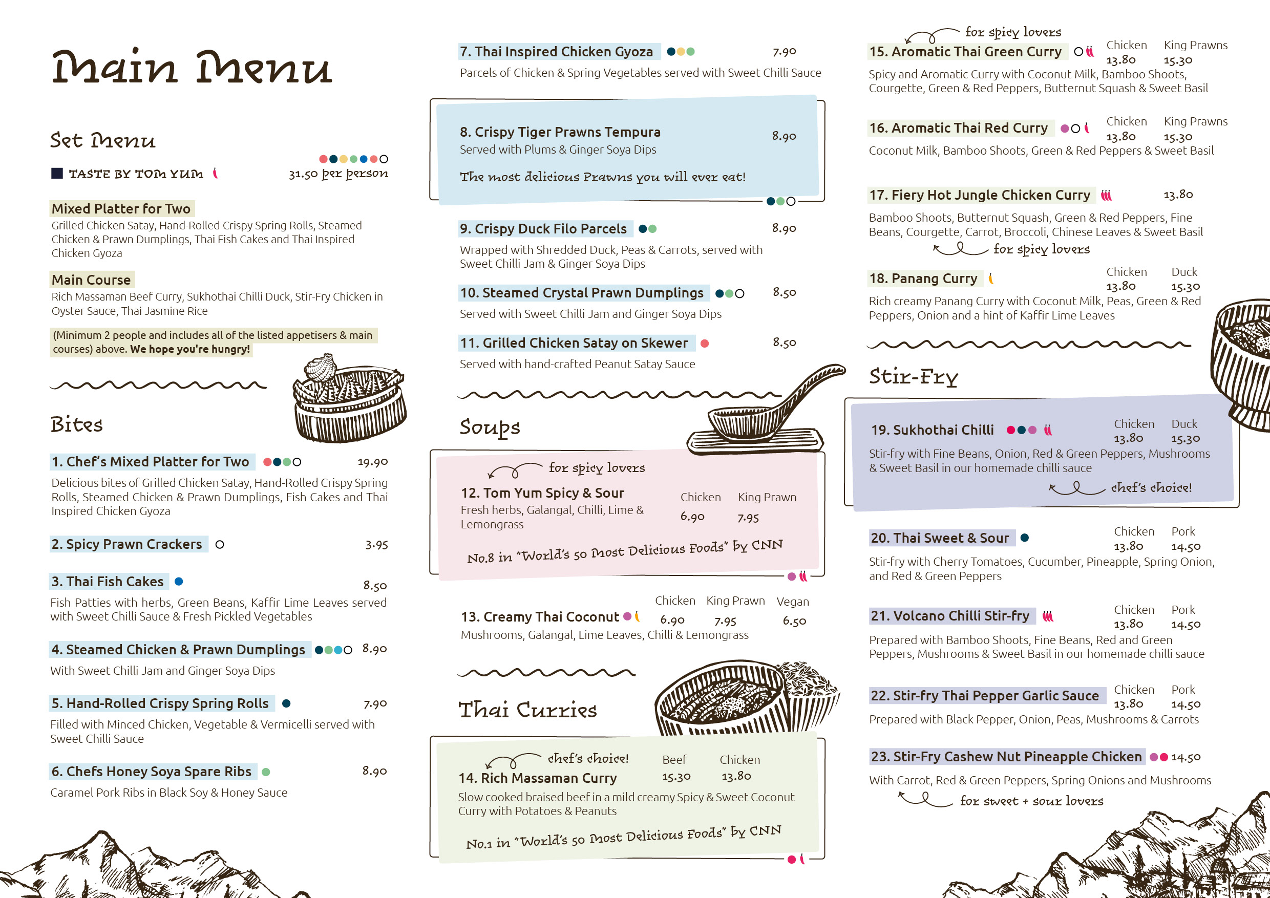Our menu is carefully created so the combination contrasting flavours of hot, sour, salty and sweet are perfectly balance. The resulting menu is a luscious balance of textures, flavours and aromas. The staff are able to advise you on the best combination of dishes (hot, sour, salty and sweet) in order to get the best balance of flavours during your meal.
